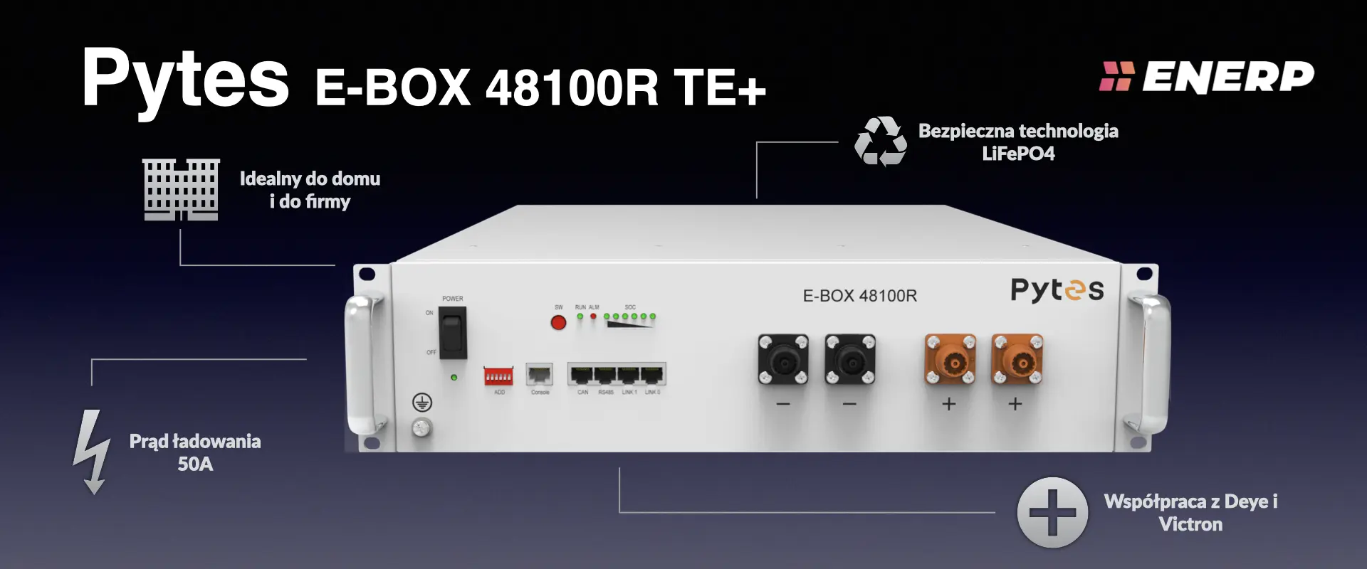 E-BOX 48100R TE+ zwiększa autokonsumpcję energii z PV, obniża rachunki i poprawia niezależność energetyczną. W firmie działa jako bufor i zasilanie awaryjne, ułatwiając arbitraż dobowy i stabilizację kosztów. W konfiguracjach 48 V z Victron Energy i Deye sprawdza się jako serce systemu – magazyn energii Pytes, który szybko przyjmuje nadwyżki i oddaje moc w godzinach szczytu.